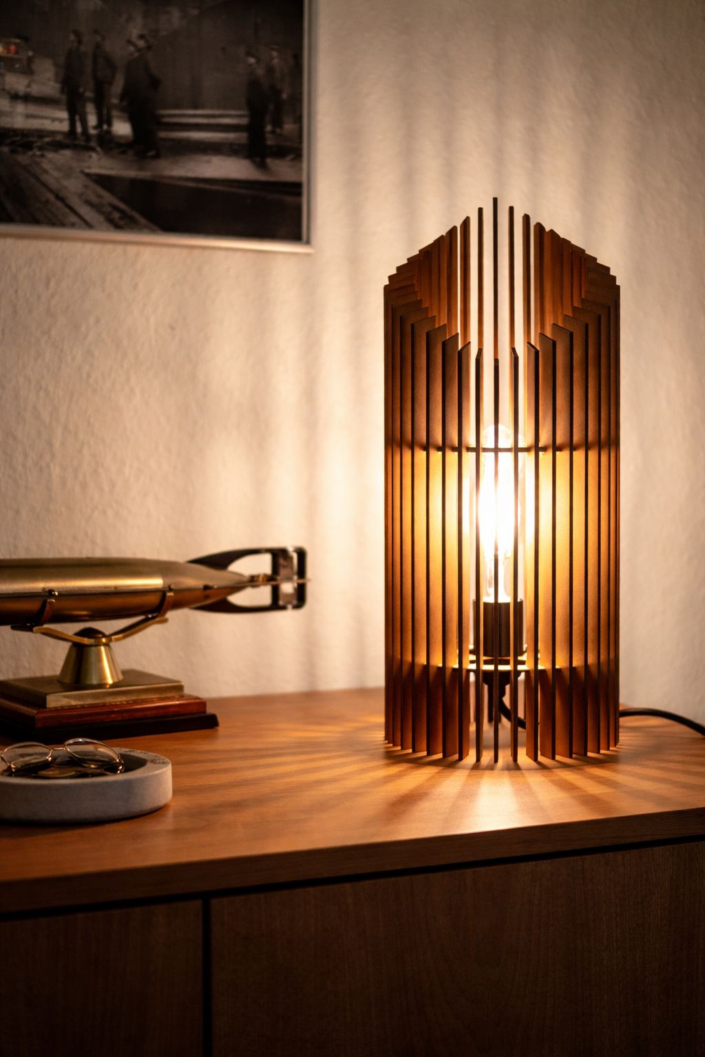 PK-Bordlampen forener skandinavisk minimalisme med arkitektonisk elegance. De lodrette lameller i træ skaber et raffineret lysspil, når lampen tændes, og spreder et varmt, behageligt skær, der tilfører rummet både ro og atmosfære.